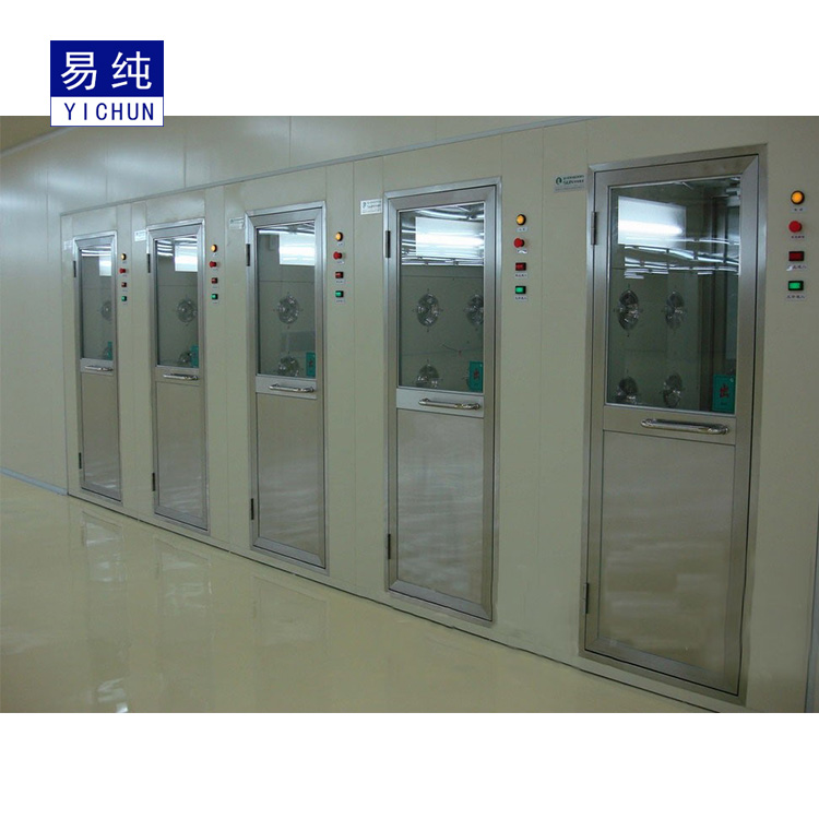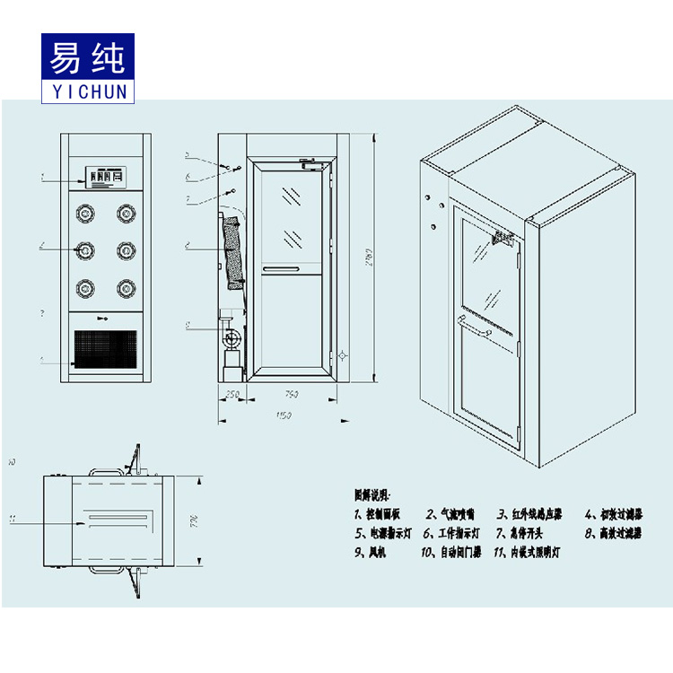 1.風淋室由箱體、風淋門、粗效過濾器、高效過濾器、風機、靜壓箱、噴嘴聯(lián)鎖控制器,操作面板,感應裝置等幾大部件組成。