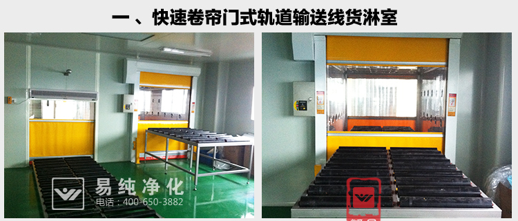 3、電動(dòng)升降門貨淋室(門為電動(dòng)控制上下升降),流水線被截?cái)喑扇糠?,分別為潔凈區(qū)外,貨淋室內(nèi),潔凈區(qū)內(nèi);