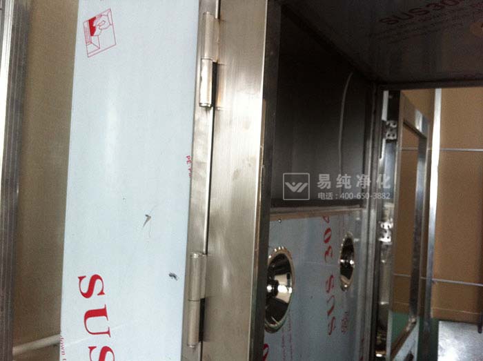 (四)整體框架完成之后,再進行門安裝,門和門框皆由不銹鋼方管及不銹鋼制作,鉸鏈采用三道不銹鋼鉸鏈加固,原門框與門板已經由廠家出廠前已經安裝好。此時只需要將鉸鏈固定于風淋側面廂體之可。如果門安裝好之后門框與箱體之間縫隙不齊平有摩擦,那么是因為地平不平而導致,此步驟并不需要調整門框,只需要對風淋下部進行垂直校正,將風淋底盤墊平即可。可反復調試四角加墊片,一旦墊平,門體將會與箱體縫隙完全整齊。